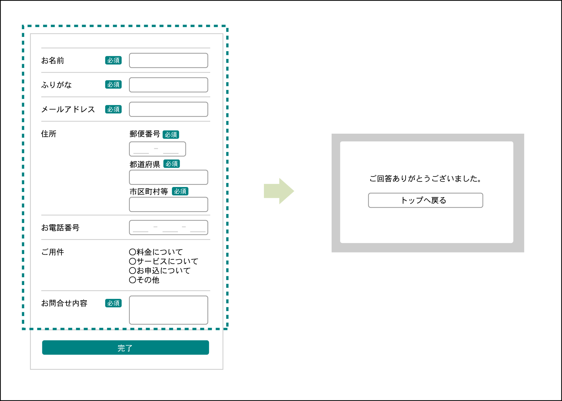 例:サービスについての回答ページと、お客様情報を入力していただくページを分けて表示することができます。