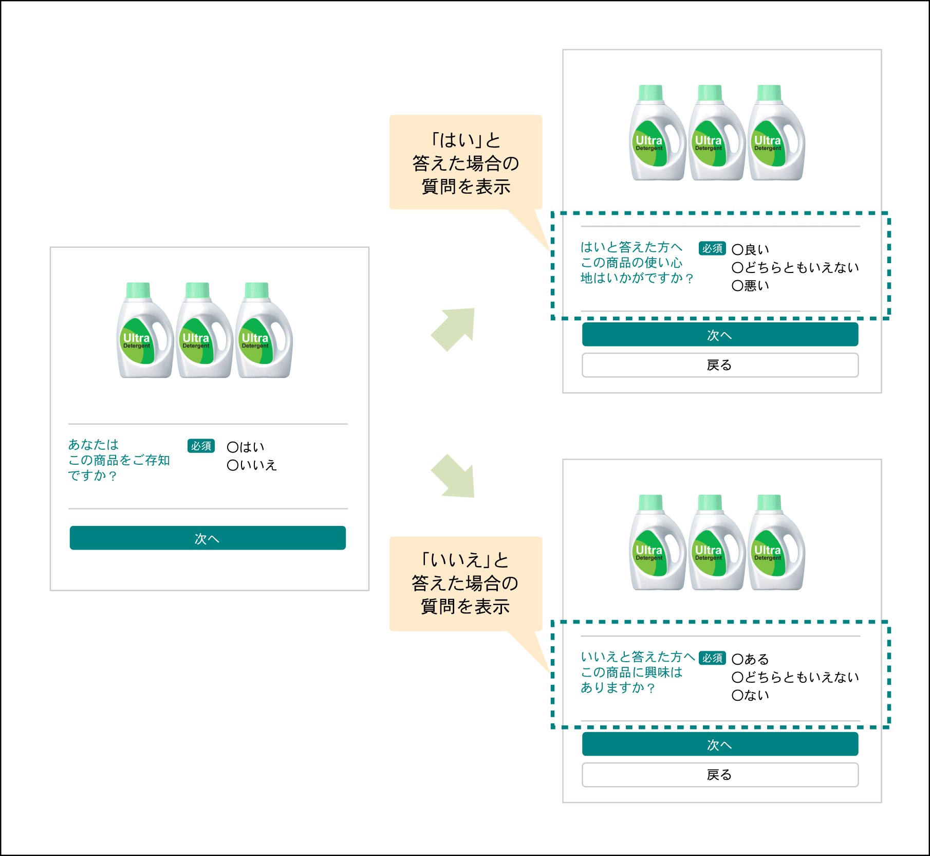 例:商品Aをご存知ですか?〇はい〇いいえ で「はい」と答えた人や「いいえ」と答えた人それぞに違う質問を表示するということができます。