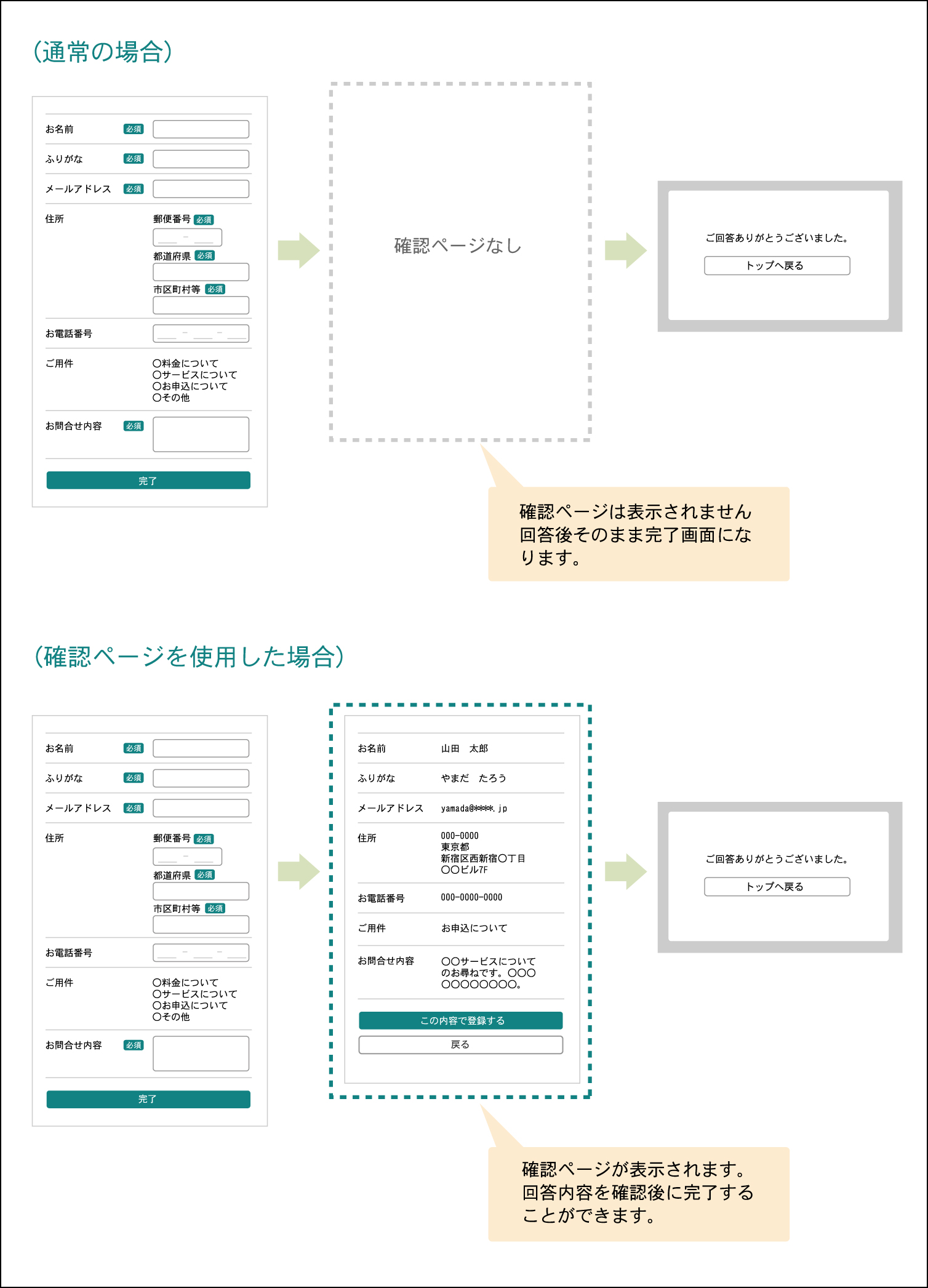 機能一覧 確認ページの設定 フォーム回答後に回答内容の確認ページを表示することができます。 確認ページを使用することで、内容に誤りがあった場合などに「戻る」で 再度回答が行えるため、回答内容の間違いを減らすことが可能になります。 まずは使ってみてください! 活用シーン フォームサンプル