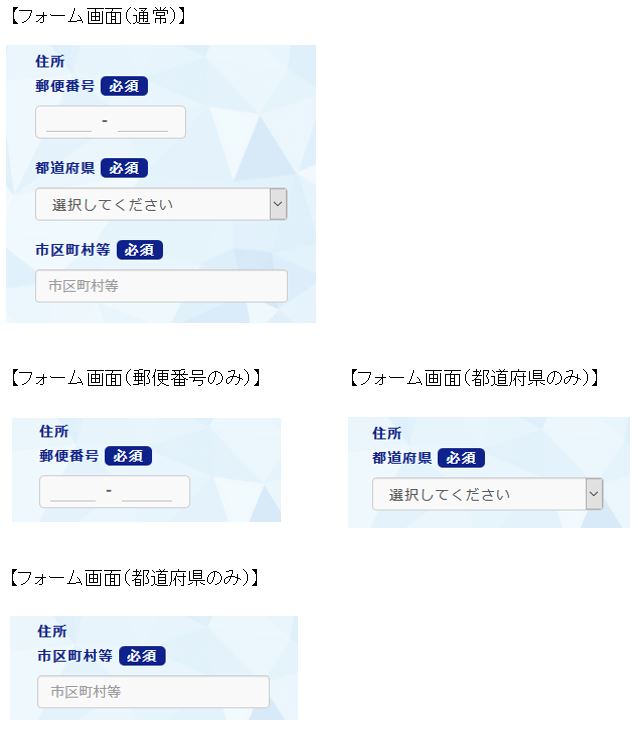 郵便番号、都道府県、市区町村を入力する形式です。