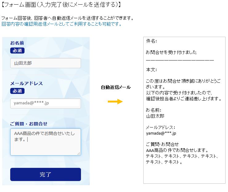 ※取得したメールアドレスに対して、回答後の内容を確認メールとして送信することも可能です。